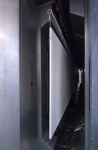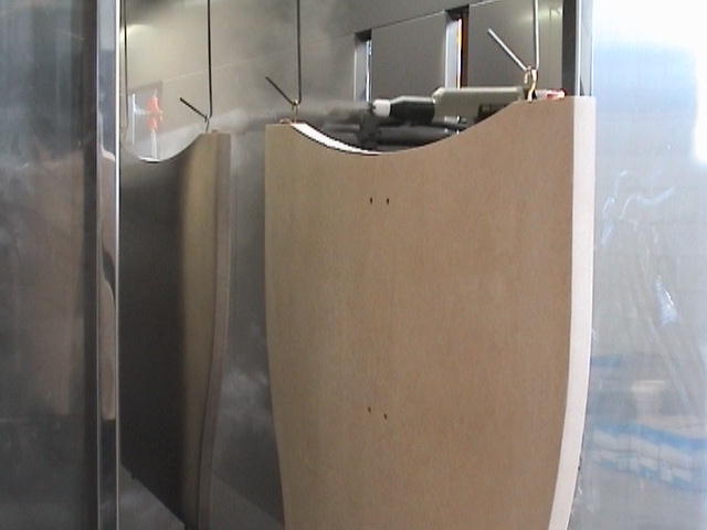 The electrostatic application of the powder utilises the moisture in the board (ideally 4-8%) to attract the charged powder. Like in metal coating, the substrate needs to be cleanly grounded. The board is lightly pre-heated to around 60c, which helps draw the moisture to the surface and then the powder is applied. Managing film thickness and consistency, particularly on the edges of the MDF, is key to avoid blistering during cure, thick edges and appearance inconsistency. This can be controlled with the use of counter electrodes in the coating booth, positioned opposite the powder applicators, they help prevent a buildup of powder on the edges by drawing excess powder spray away from the part.